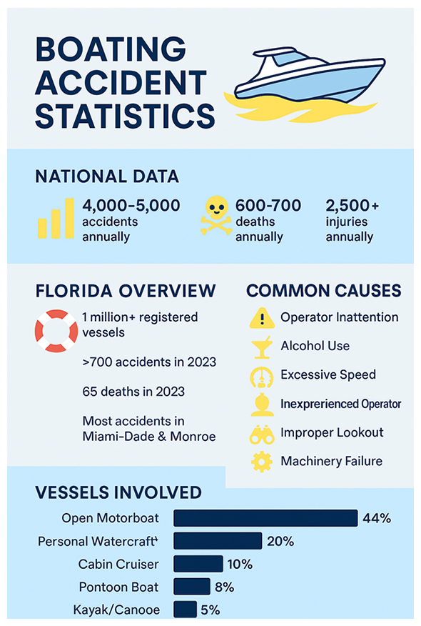 - Collisions with another vessel are the most frequent type of accident nationwide and in Florida (~25–30% of all accidents).